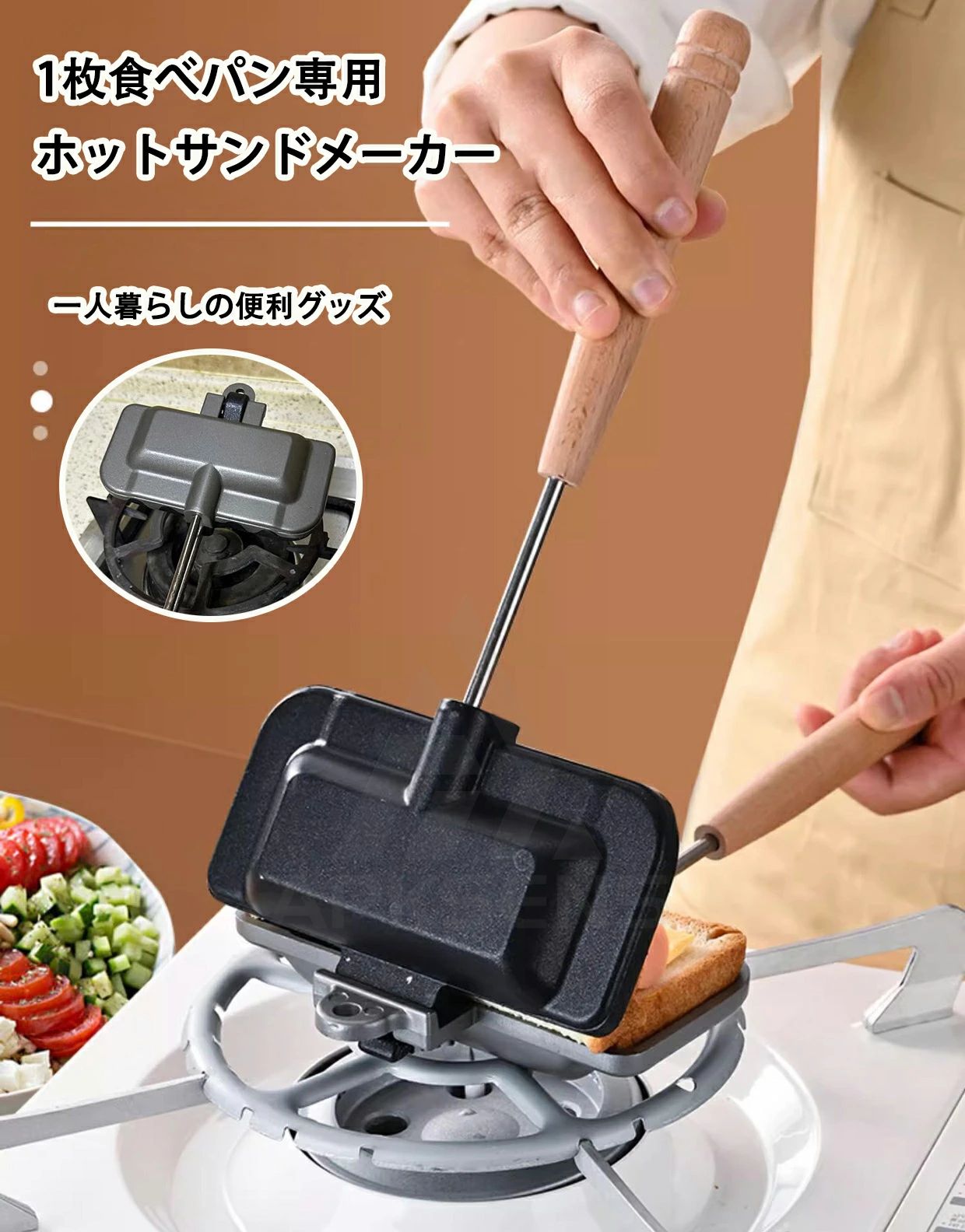 ホットサンドメーカー 直火 両面焼きフライパン 上下分離型 木製ハンドル 一人用 取っ手が取れる ア・・・