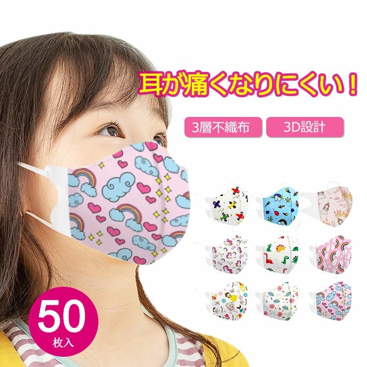 マスク柄付き子供用不織布マスク小さめキッズマスク99%カット使い捨てマスク3D立体加工3層立体構造幼・・・