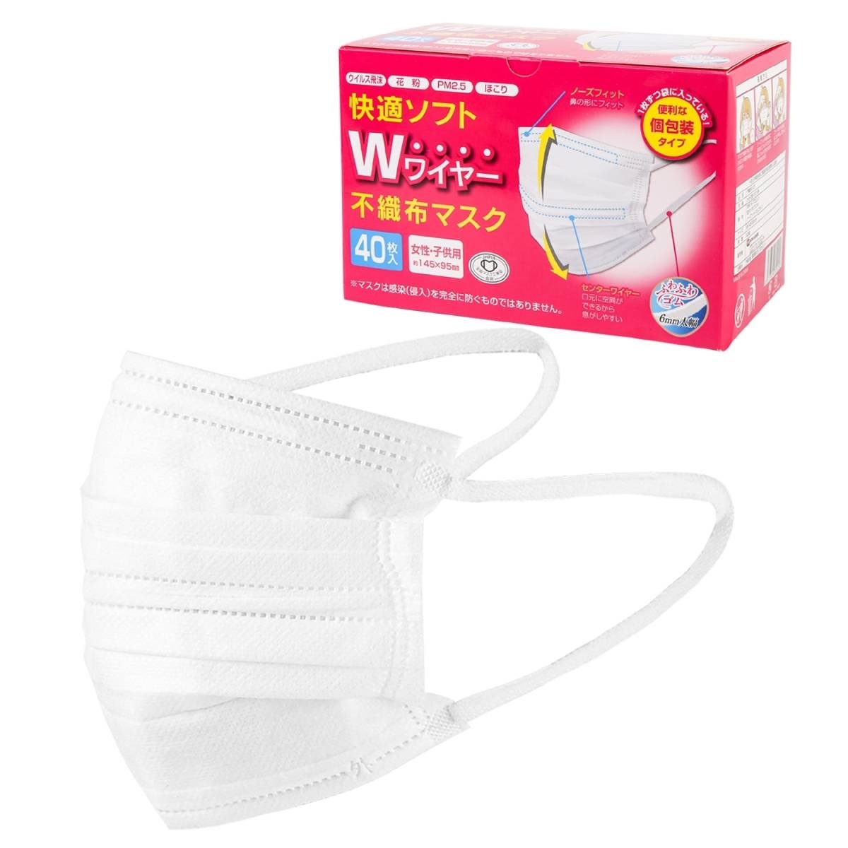 快適ソフトwワイヤー 不織布マスク40枚入(個包装) 耳が痛くなりにくい 女性 子供用 不織布 3層・・・