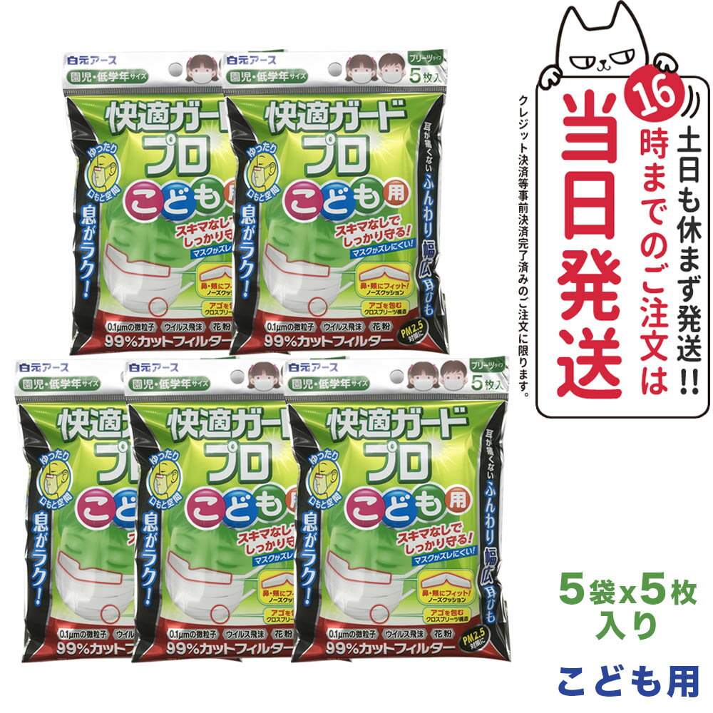 【5個セット】白元アース 快適ガード プロ プリーツタイプ マスク 5枚入 ホワイト こども用 園児・・・