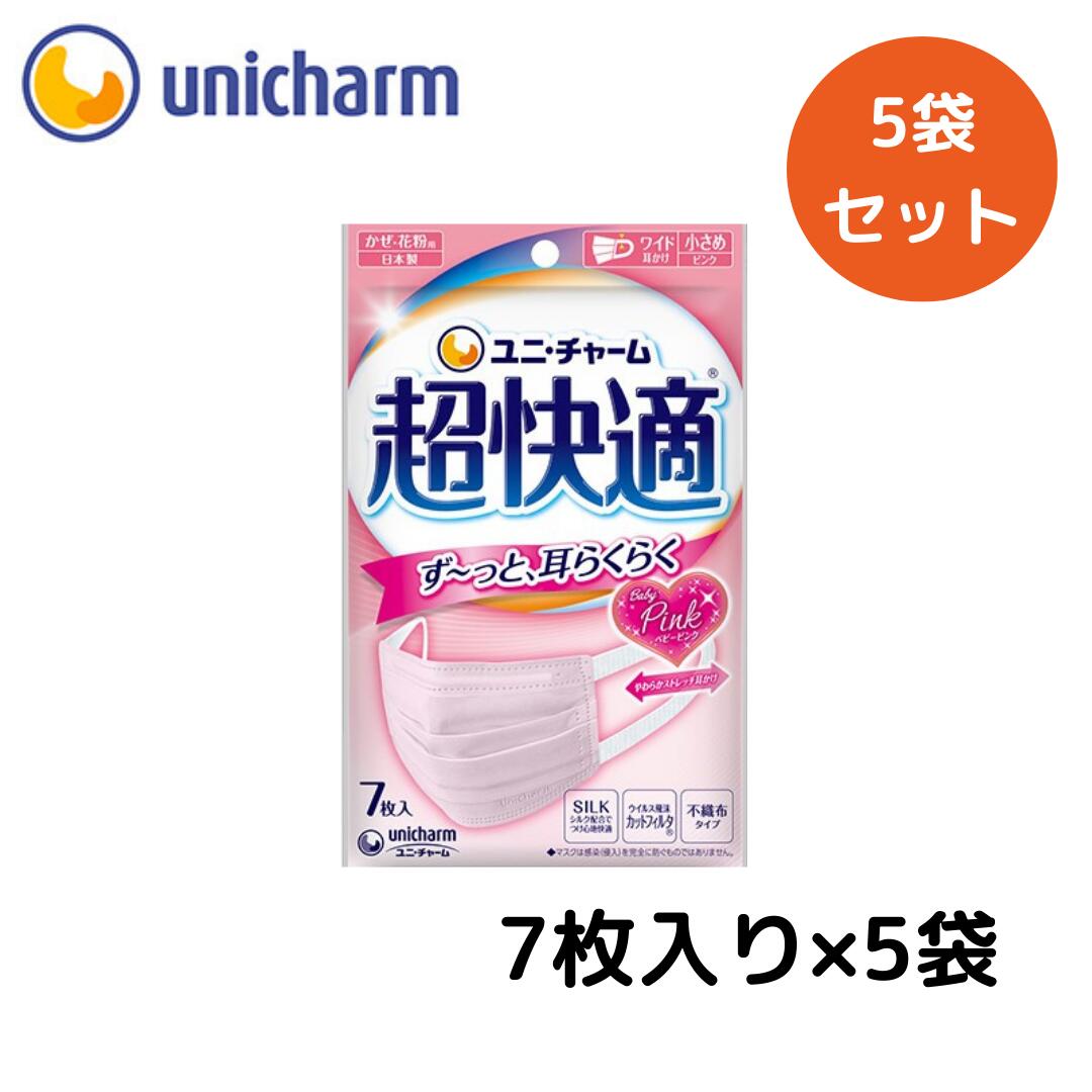 ユニ・チャーム 超快適 マスク プリーツタイプ ピンク 小さめ サイズ 7枚 【5個セット】 不織布・・・