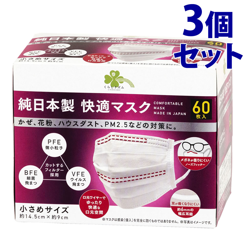 《セット販売》 くらしリズム 純日本製 快適マスク 小さめサイズ 約14.5cm×約9cm (60枚・・・