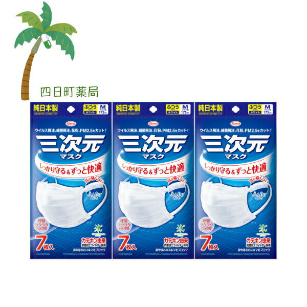 【興和】三次元マスク ふつう Mサイズ ホワイト 7枚 [3個セット] 純日本製 耳が痛くない ふん・・・