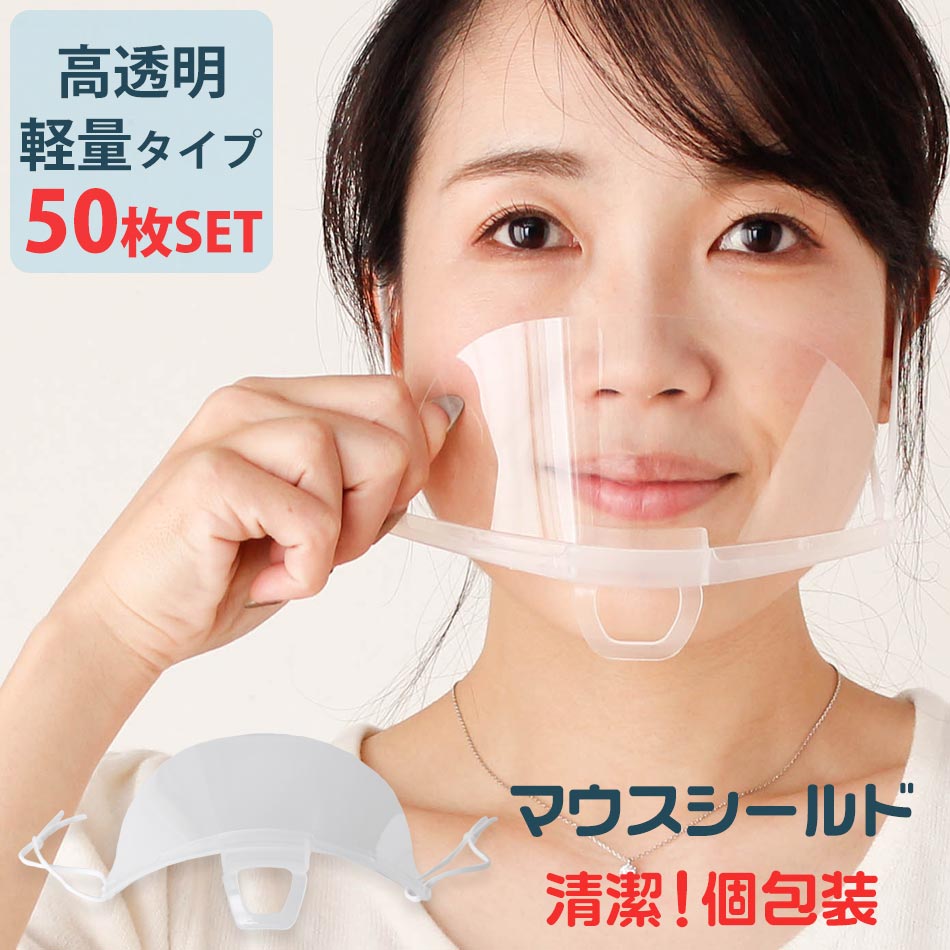 飛沫防止やウイルス対策のための透明マウスシールド50枚セット。業務用としてもお使いいただけます。クリアタイプなので接客業におすすめのアイテム!