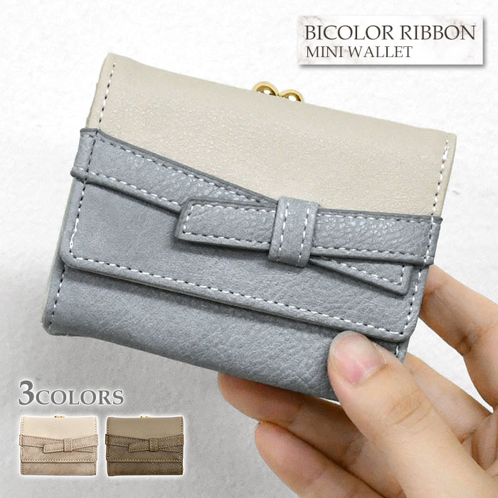 バイカラー リボン ミニ財布 3つ折り財布 折財布 女性 女子 ボックス型 ボックス型小銭入れ 合成皮革 小物 雑貨 ギフト プレゼント 小物 雑貨 グレー ピンク ブラウン