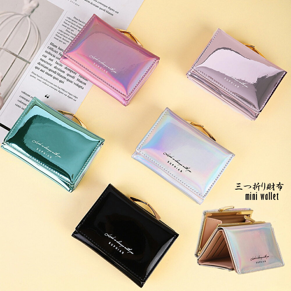 がま口三つ折り財布 ミニウォレット 韓国 オーロラカラー ミニ財布 小銭入れ カード入れ 軽い 小さ・・・