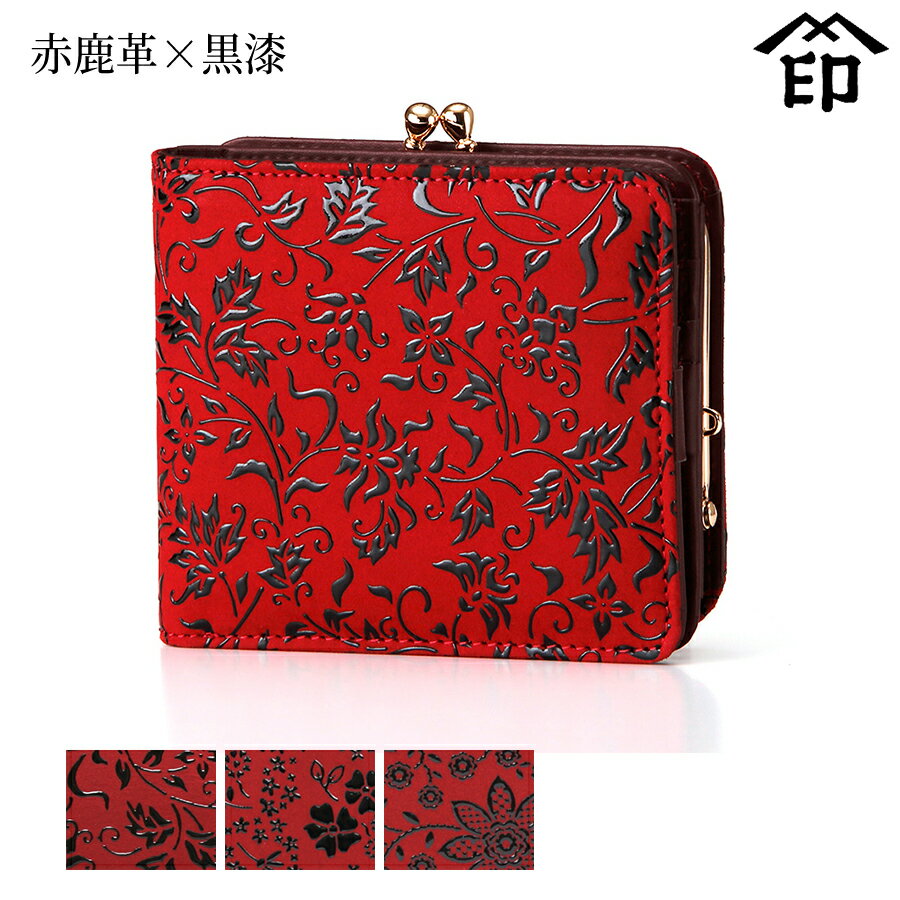 甲州印伝 ≪ 印傳屋 ≫ 1608 がま口札入れ[赤鹿革×黒漆] 【花唐草/アメリカンブルー/クレマ・・・