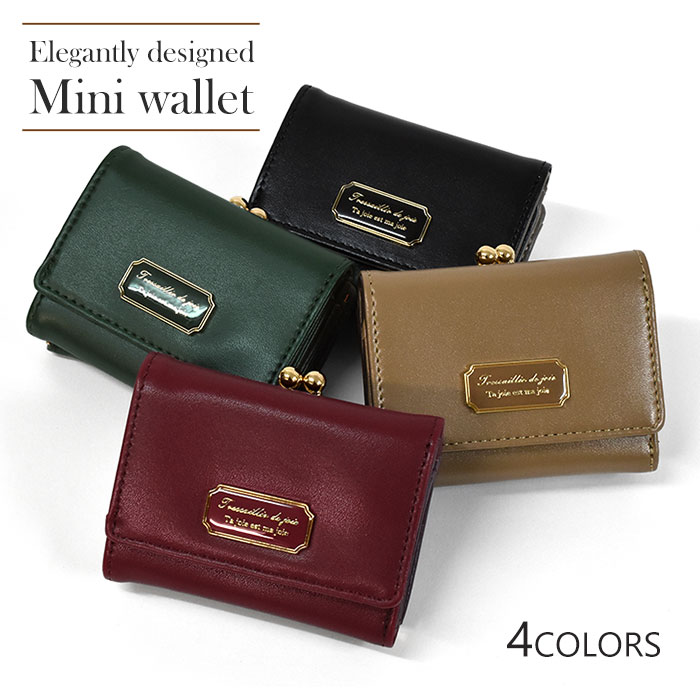 フェイクレザー プレート がま口 三つ折り ミニ財布 さいふ サイフ ミニ 女性 女子 コインケース 小銭入れ 手のひらサイズ ブラウン ワインレッド グリーン ブラック 黒