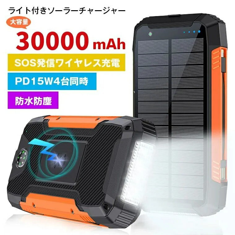 モバイルバッテリー ソーラーバッテリー 30000mah 防災 大容量 ソーラーチャージャー ソーラー 充電器 急速ライト