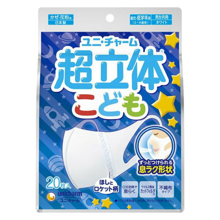 【20枚入×5袋セット送料込】ユニ・チャーム 超快適 超立体マスク こども用 ホワイト ほしとロケッ・・・