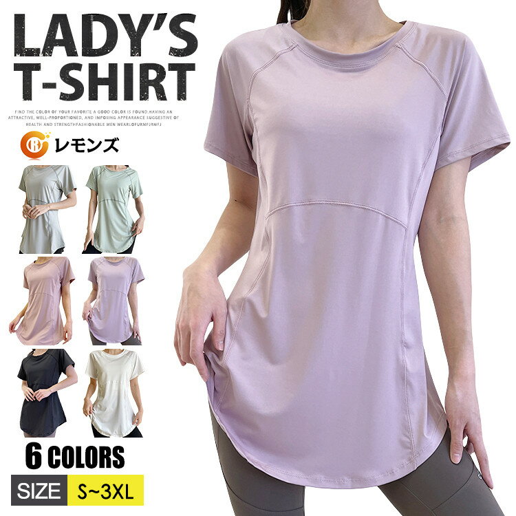 Tシャツ ヨガウェア レディース トップス 半袖 ロング丈 スポーツ ジム ルームウェア 体型カバー・・・