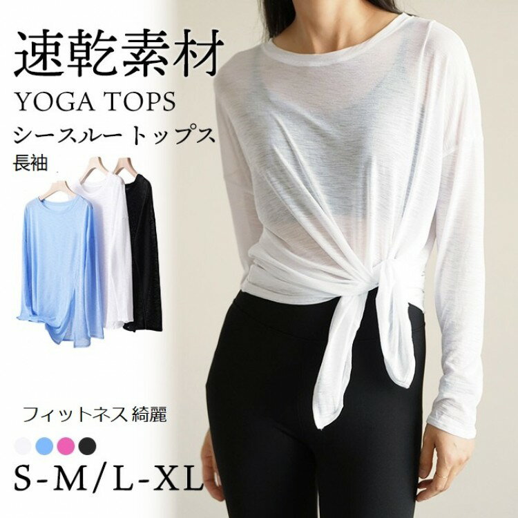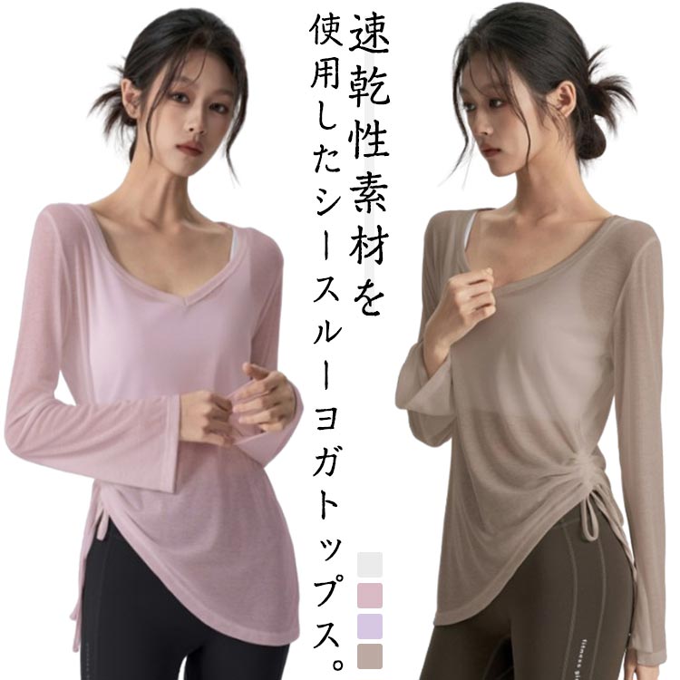 ヨガ 長袖 薄手 ヨガウェア 速乾素材 ドロップショルダー シースルー シアー ロング丈 Tシャツ ・・・