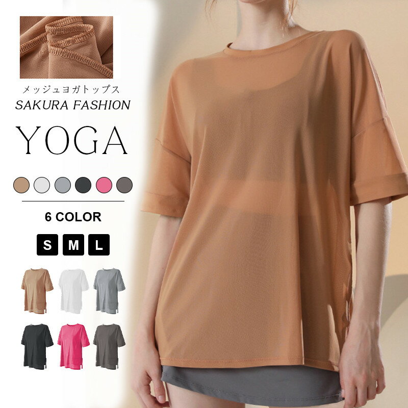 Tシャツ ヨガトップス レディース ヨガ 速乾 ヨガウェア Tシャツ シアー シースルー メッシュ ・・・