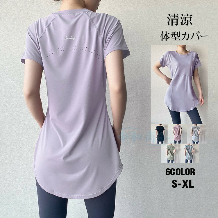 Tシャツ レディース ヨガウェア トップス 半袖Tシャツ ヨガtシャツ ロング丈 速乾 丈長 体型カ・・・