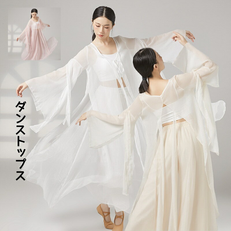 古典ダンストップス レディース ダンス衣装 長袖 フレア袖 ロング丈 透け感 紐あり リボン ゆった・・・