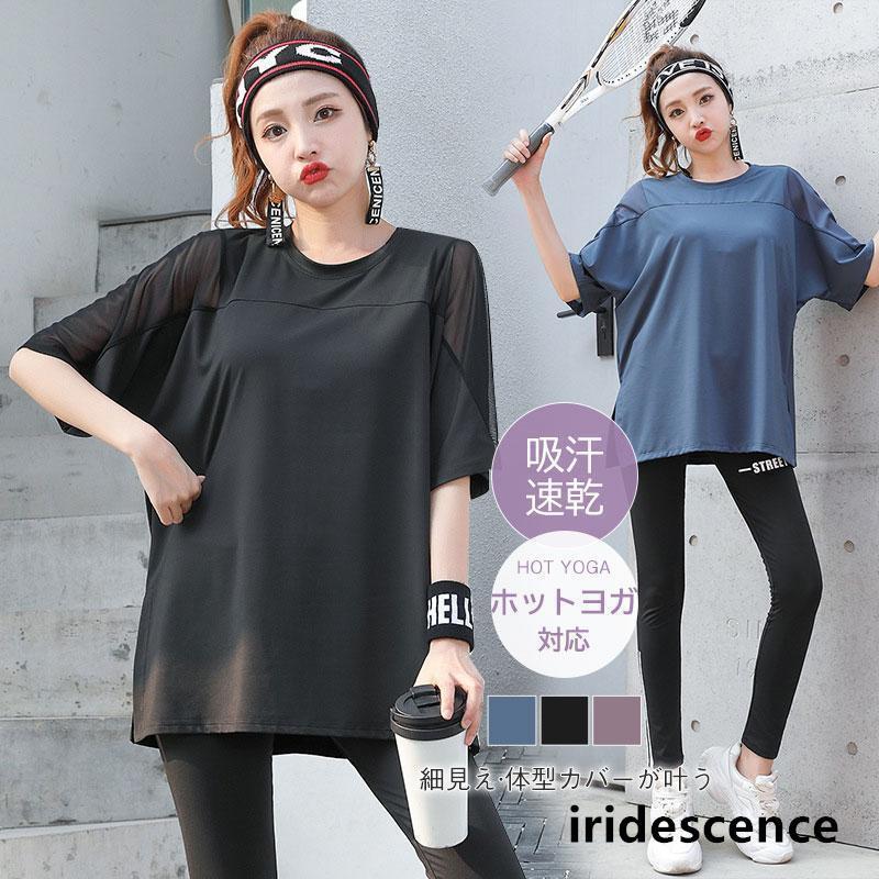 ヨガウェア ヨガ tシャツ スポーツウェア レディース 半袖 ロング丈 メッシュ ホットヨガ