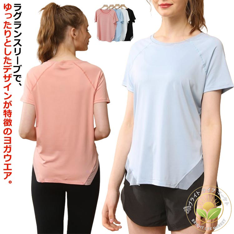 半袖 ラグランスリーブ 薄手 ヨガ トップス 通気性 サイドスリット Tシャツ 伸縮性 体型カバー ・・・