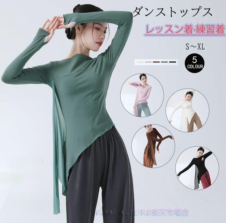 レディースダンス衣装 長袖Tシャツ ロング丈ブラウス スリット入り ダンストップス ヨガトップス ヨガウェア 細見え ストレッチ レッスン着 練習着 団体服 新体操 バレエ 古典ダンス