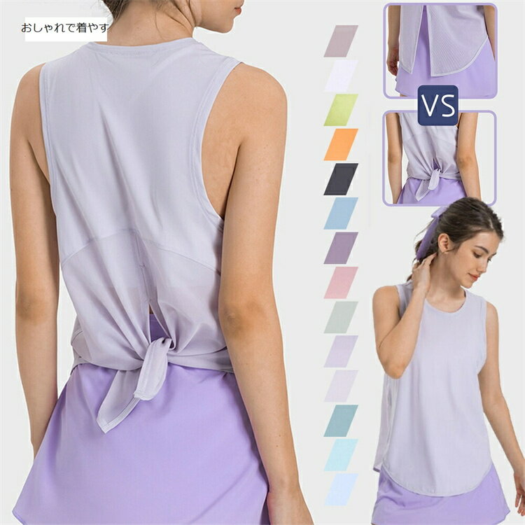 タンクトップ ヨガウエア 裾 調整可能 ストレッチ ヨガ初心者 ダイエット 動きやすい 楽 体型 隠す ゆったり 大きめ ホワイト ブラック パープル ピンク ブルー 白 黒 運動 健康