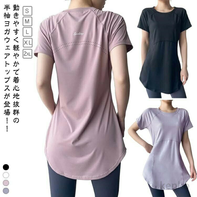 ロング丈 半袖 ヨガウェア ラウンド裾 Tシャツ レディース 吸汗速乾 ホットヨガ ホットヨガウェア・・・