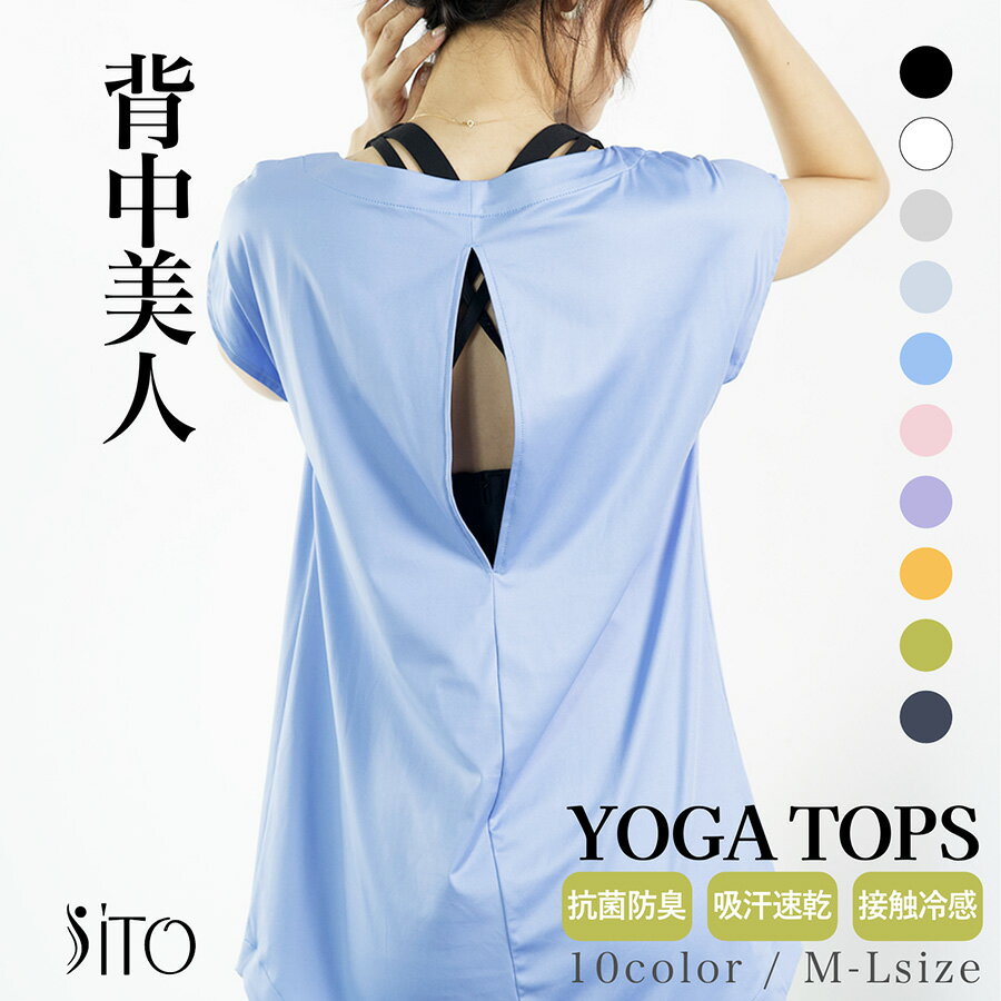 ヨガ ウェア 背中 あき トップス レディース ツルツル素材 軽い 着丈長め 丈が長い お尻周りカバー M L サイズ ホワイト ブラック ピンク サックス ベージュ グレー サックス ブルー