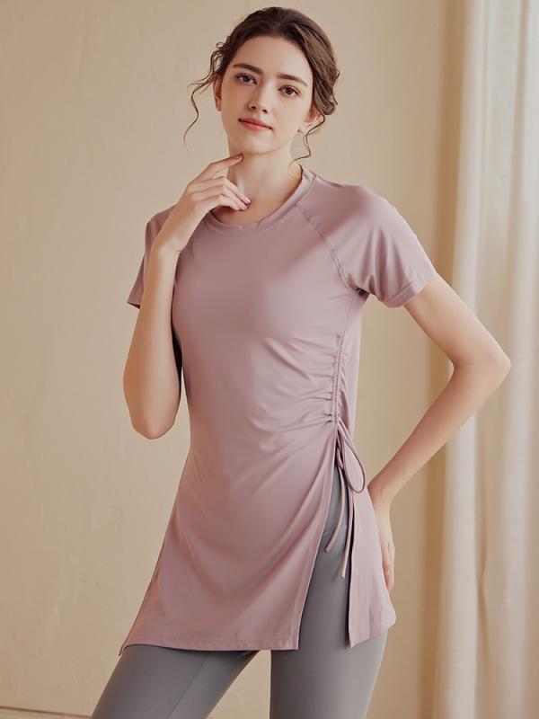 ヨガウェア トップス 細見え サイド ギャザー 立体感 スリット 脚長効果 ラウンドネック 丸首 胸元が見えにくい ロング丈 体形カバー ストレスフリー 長袖 トップス
