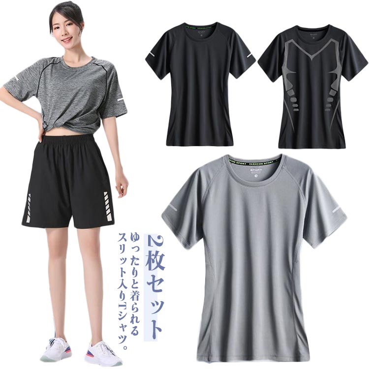 2枚セット 速乾 ドライTシャツ 半袖 スポーツ 無地 ドライ Tシャツ レディース メンズ ユニセ・・・