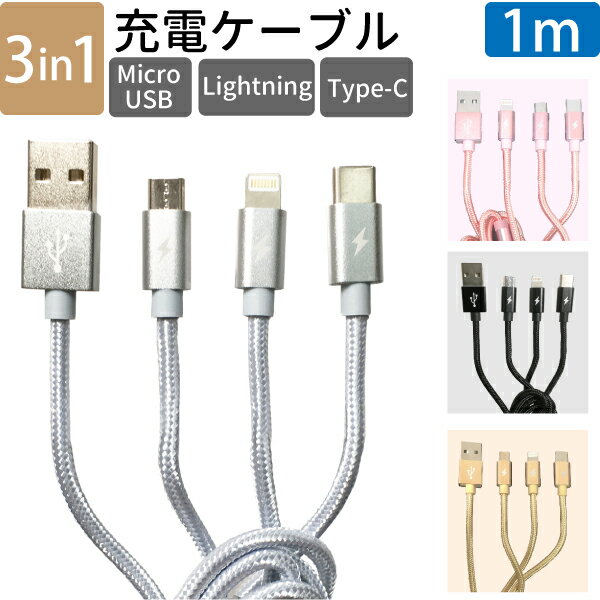 1本3役 充電ケーブル 100cm 200cm 3種端子コネクター Lightning TypeC MicroUSB