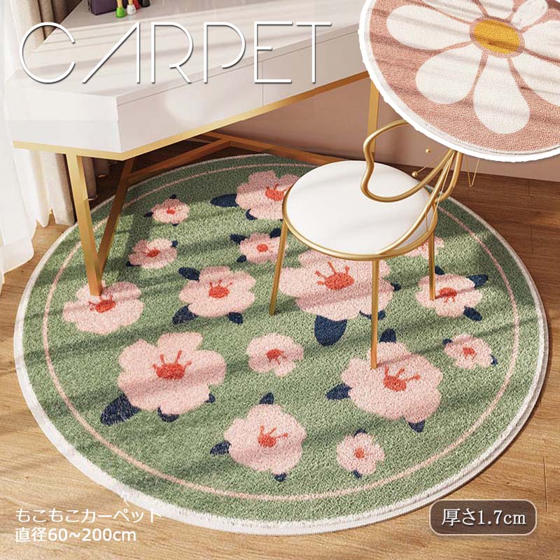 冬用ラグ 花柄 ピンク グリーン 洗える ブルー 可愛いマット もこもこカーペット 北欧 円形 四季・・・