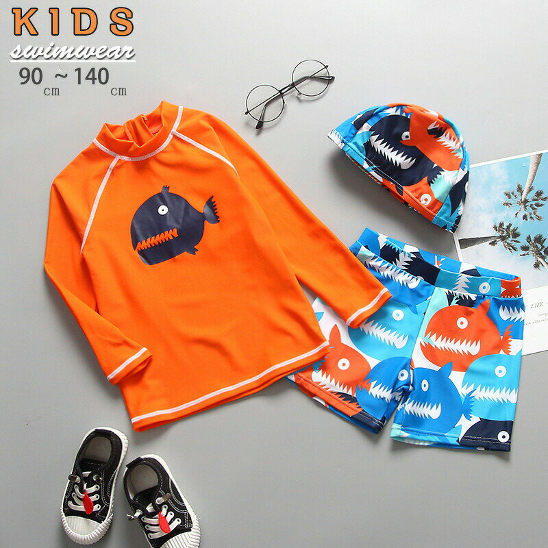 キッズ 水着 男の子 長袖ラッシュガード 3点セット 水遊び トップス パンツ 水泳帽 ジュニア スクール プール 水遊び 海水浴 男の子 紫外線対策
