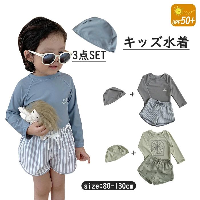 水着 ベビー キッズ 男の子 水着 スイムウェア 上下セット 帽子付き 3点セット ラッシュガード UVカット UPF50+