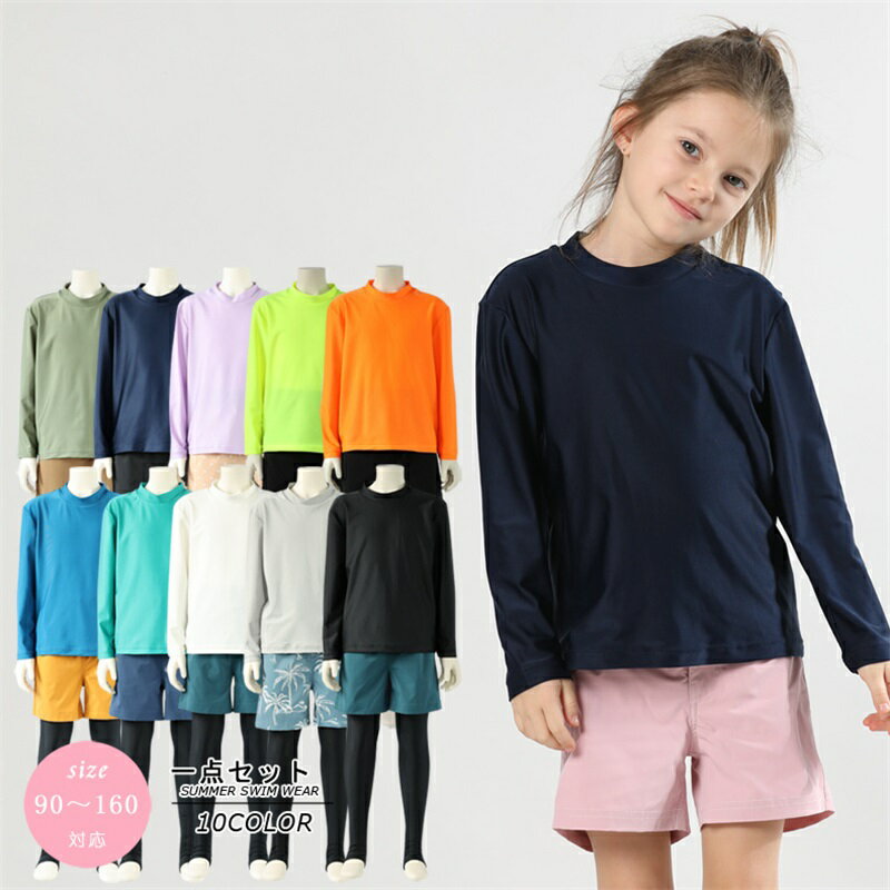 ラッシュガード キッズ 長袖 フードなし 子供用 UV 対策 男の子 女の子 白 紺 青 カーキ 緑 黄色 水着 無地 簡単着脱 シンプル スクール水着 小学生 学校 スイムウェア 子供 海