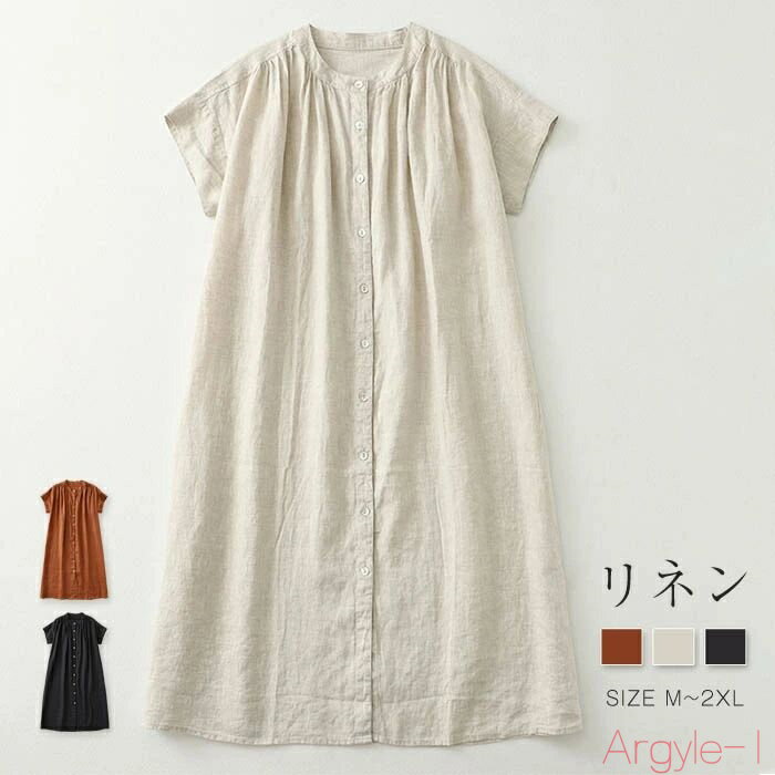 ワンピース レディース 夏 シャツワンピース 半袖 麻・リネン 羽織 バンドカラー シャツワンピ Aライン ギャザー 無地 ゆったり 体型カバー カジュアル 大人女子 大人可愛い