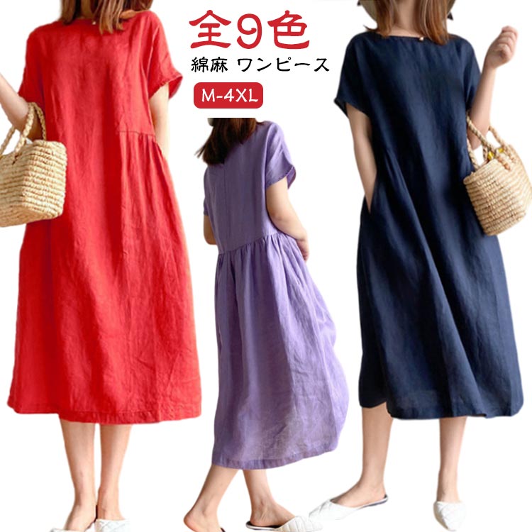 コットン リネン 綿麻ワンピース 半袖 きれいめ ゆったり 綿麻