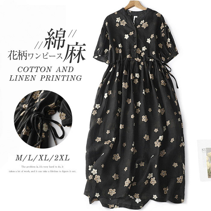 綿麻 ワンピース レディース 花柄 半袖 マキシワンピース 薄手 ロングワンピース リネンワンピース 体型カバー