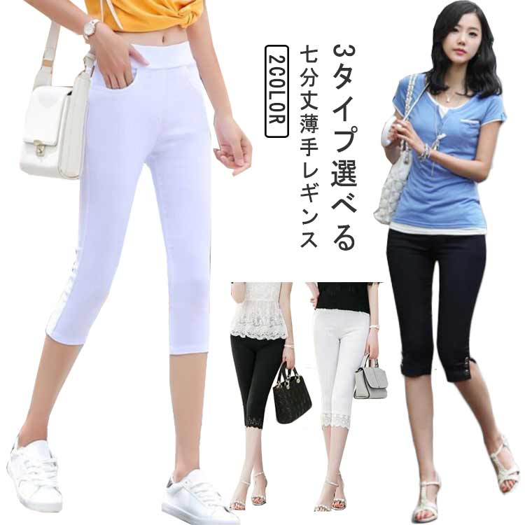 七分丈 レギンス 薄手レギンス 3タイプ選べる ストレッチレギンス レース付き ボタン ポケット レディース