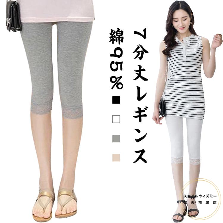 ナチュラル 夏用 レギンス レディース 涼しい コットン 薄手 7分丈 大きいサイズ グレー レース・・・