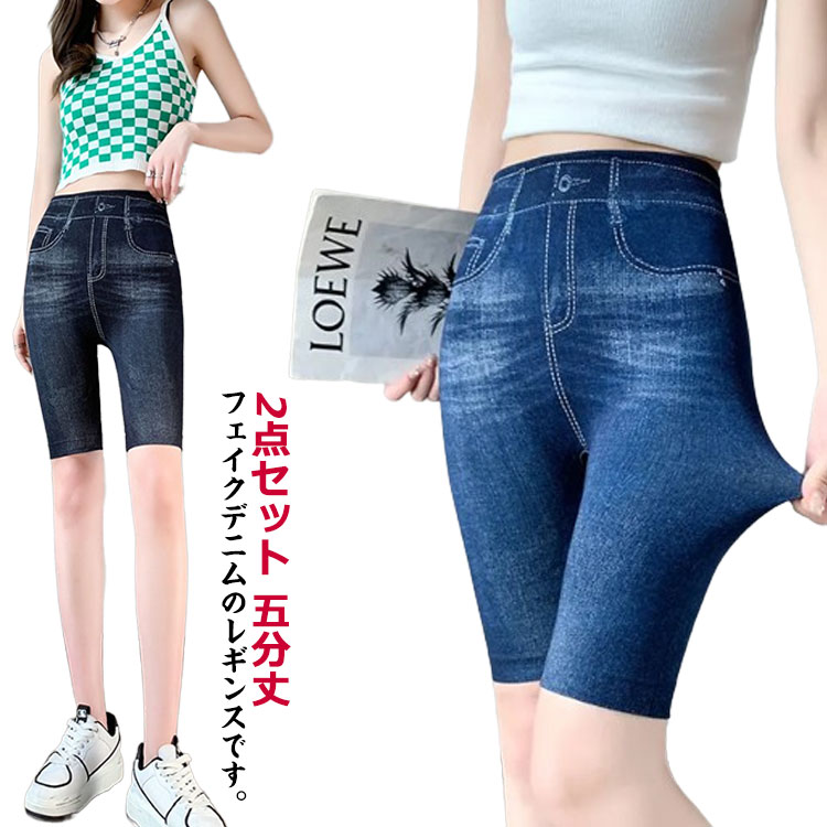 2点セット フェイクデニム 夏用 5分丈レギンス レディース ストレッチ デニム ジーンズ 柔らかい・・・