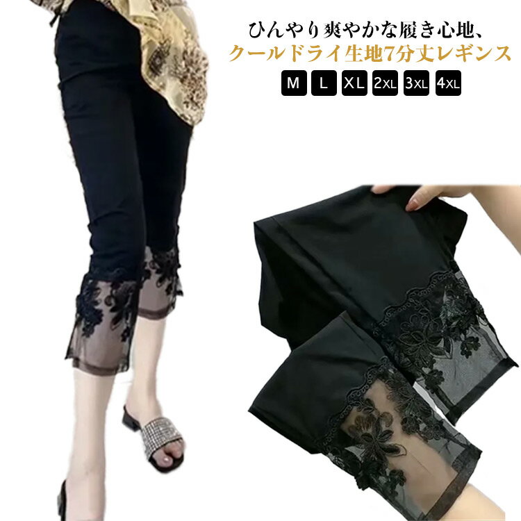 M~4XL 7分丈 レースレギンス きれいめ 薄手 夏服 ストレッチ 美脚 黒