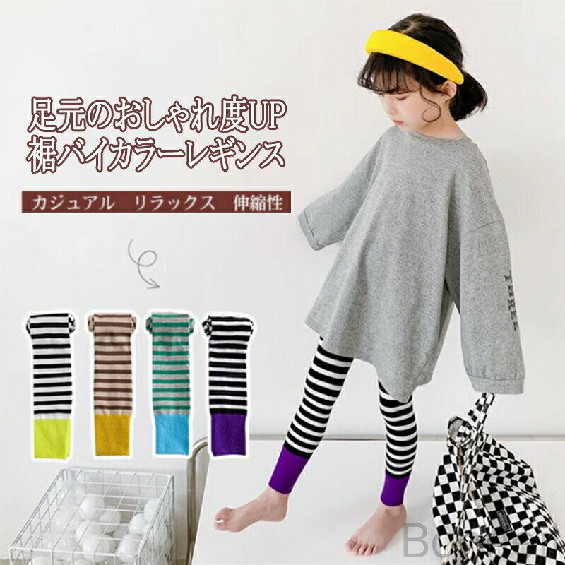 綿素材で伸縮性抜群のボーダー柄バイカラーレギンスパンツ 通園通学に最適カジュアルで穿き心地良い男女兼用