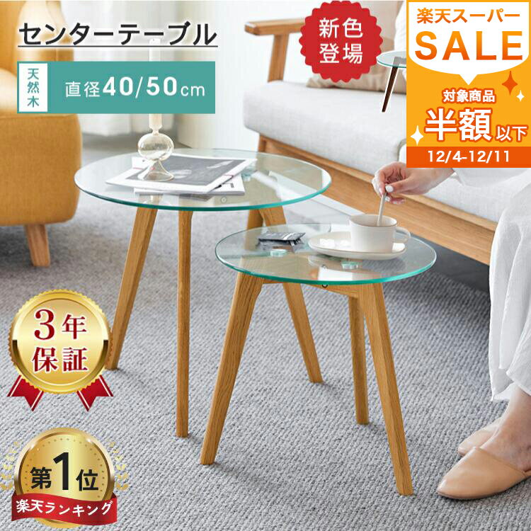 LINE友達で400円OFF【楽天1位・3年保証】サイドテーブル ガラス 木製 丸い 幅40cm セ・・・