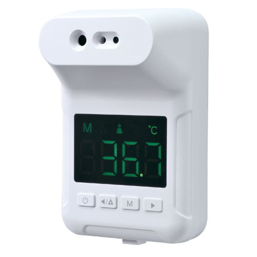 額 おでこ 非接触 「はかる」ボタンを押して適切な距離まで近づくと、自動で検温するタイプ