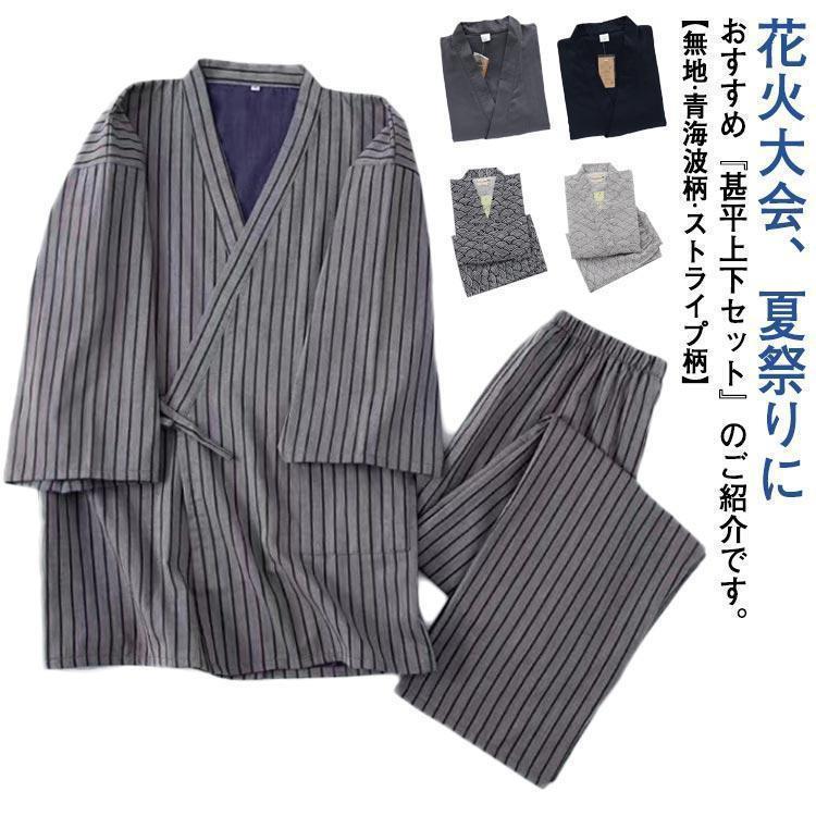 作務衣 メンズ 無地 七分袖 夏 浴衣 パジャマ 和服 上下セット 綿 麻 春 長ズボン ストライプ・・・