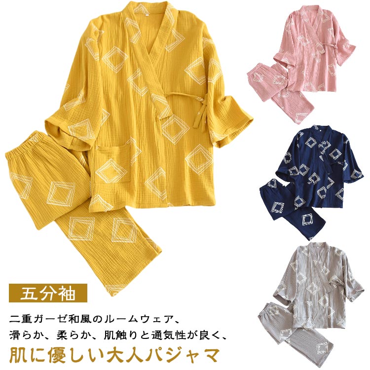 前開き 前開き コットン 綿 吸汗吸湿 部屋着 五分袖 浴衣 ガーゼ ルームウェア パジャマ 通気性・・・