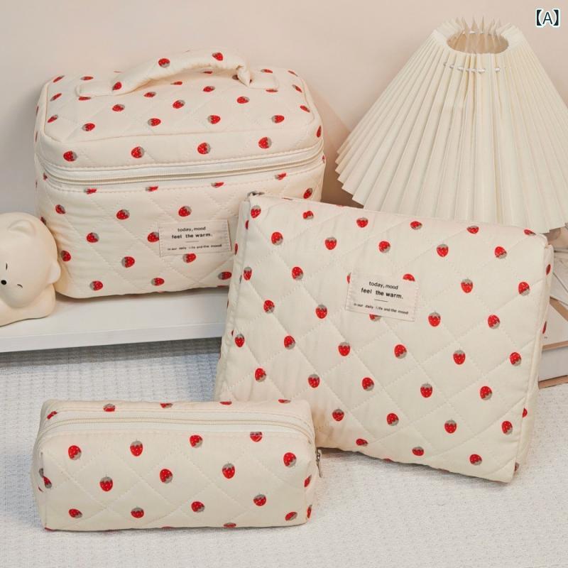 化粧ポーチ レディース 大容量 携帯用 厚手 キルティング コットン 通気性 軽量 イチゴ柄 コスメ・・・
