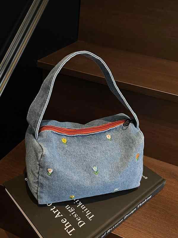 化粧ポーチ デニム 手提げ 刺繡 大容量 コスメ収納 ブラック ダークブルー ブルー・・・
