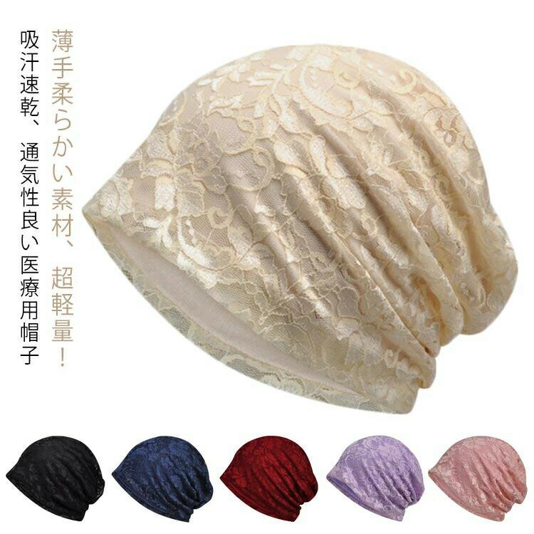 ニット帽 春夏 レディース 薄手 夏用 花柄 レース 抗がん剤 帽子