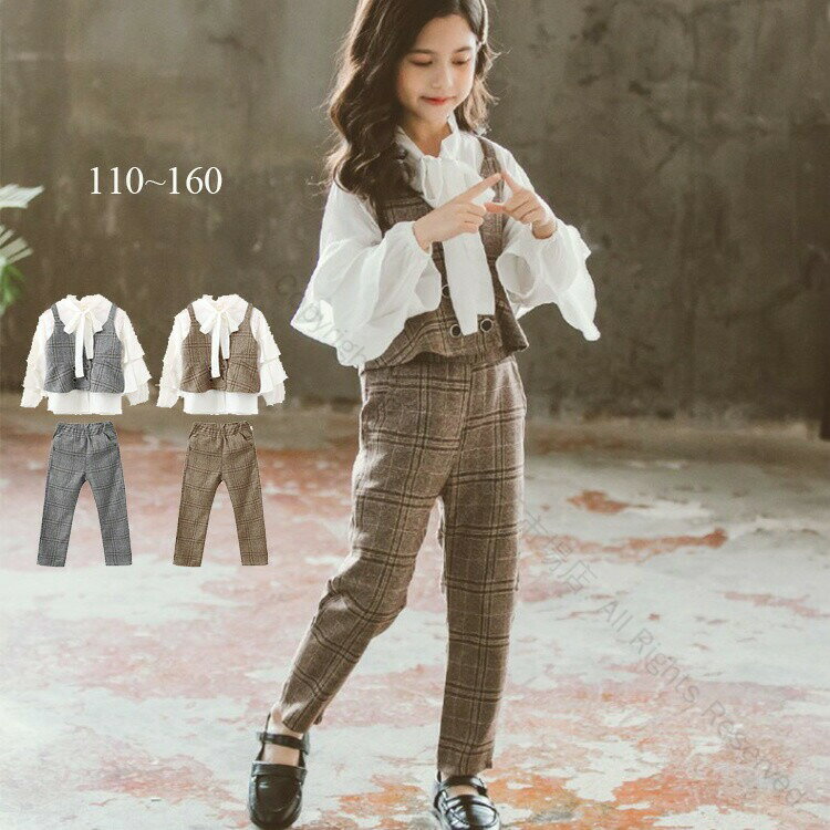 卒業式や結婚式に最適な女の子用フォーマル3点セット リボン付きシャツとチェックベスト パンツで動きやすく快適