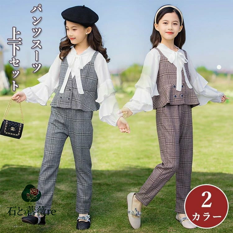 小学生やジュニア向けチェック柄パンツスーツ 卒業式 入学式 入園式 七五三 結婚式に最適なフォーマル上下セット 2色展開で大きいサイズも対応