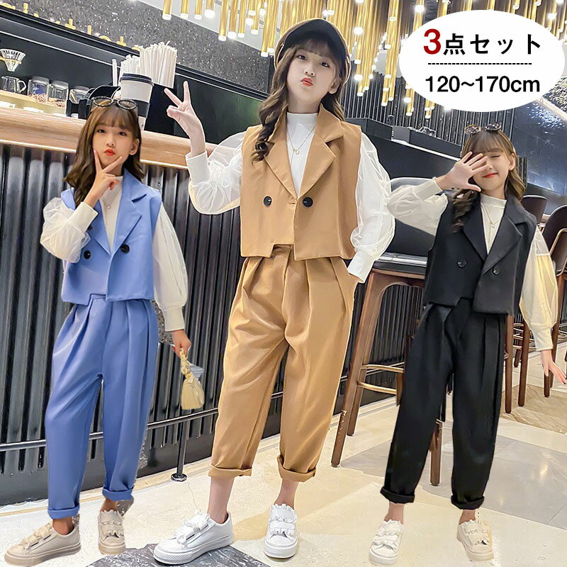 送料無料 女の子 子供スーツ 入学式 フォーマル 3点セット ベスト+ブラウス+パンツ セットアップ・・・